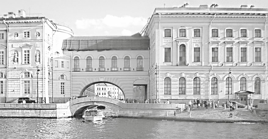 Эрмитажный мост в наше время (вид со стороны Невы). Слева видно здание Эрмитажного театра, а справа – здание Большого (Старого) Эрмитажа. Между ними арка галереи-перехода. В глубине арки – дома, стоящие на левом берегу Мойки
