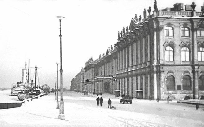 В годы блокады на Неве у Дворцовой набережной снова стояли пришвартованные суда. Это были боевые корабли Балтийского флота. Их машины приводили в действие генераторы, от которых по кабелю в Эрмитаж и Зимний дворец подавалась электроэнергия.