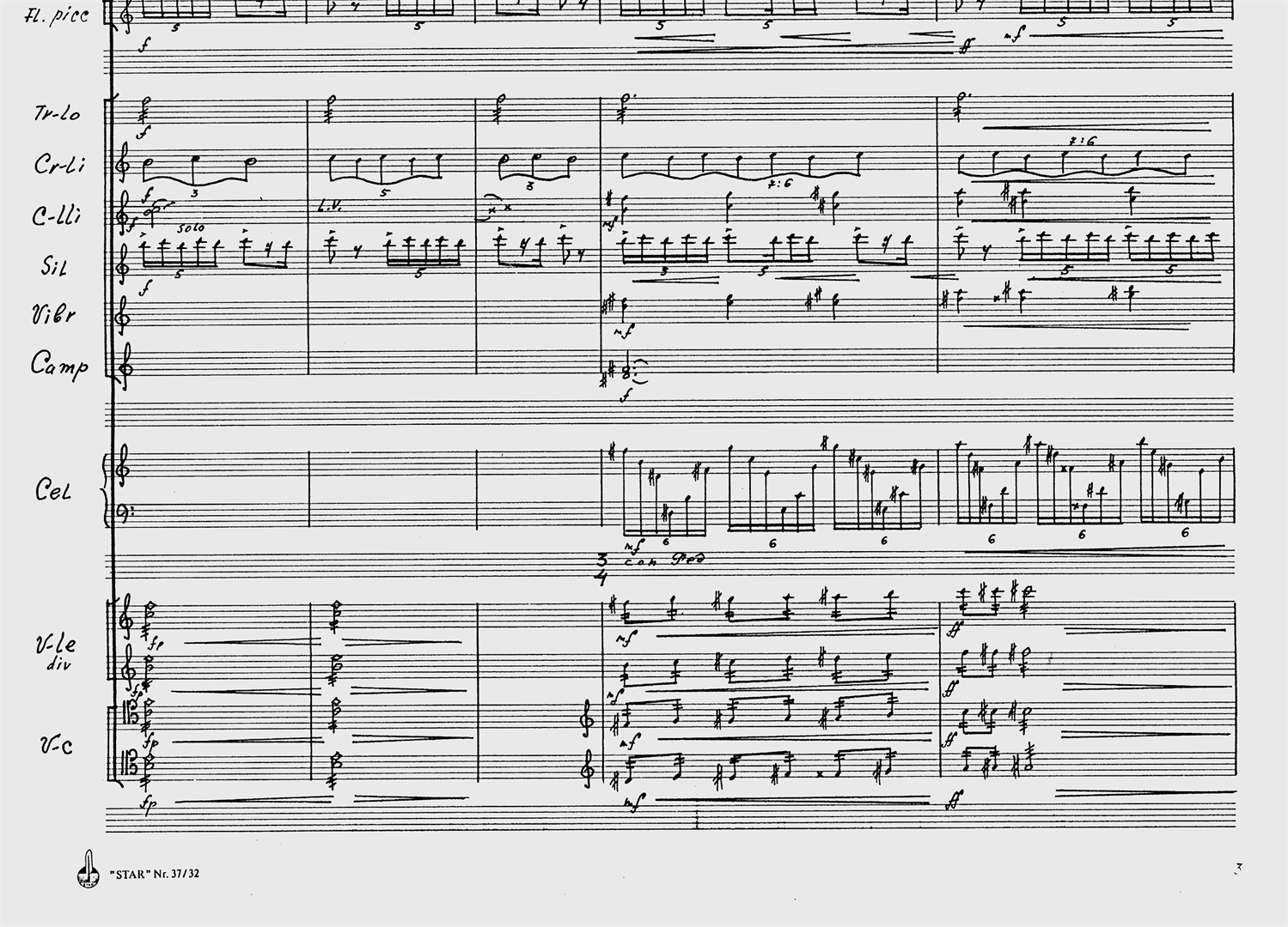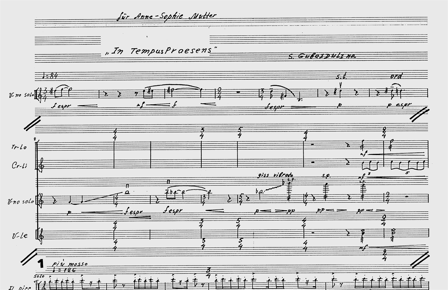 Фрагмент партитуры «In tempus praesens», второго концерта для скрипки с оркестром (2007). Из состава симфонического оркестра композитор убрала струнные, «чтобы солирующая скрипка осталась в одиночестве и с другими скрипками не было у нее соревнования».