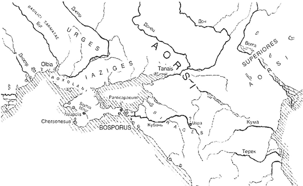 До эпохи рубежа эр в степях Северного Причерноморья наблюдается некая политическая стабильность[61]. Процесс же аридизации в первые века новой эры приводит к миграции сарматов в западном, северном и южном направлениях[62]. К I–II вв. относится и интенсивная сарматизация военного дела Боспора. Судя по иконографическому и археологическому материалам, боспорцы перенимают вооружение и, вероятно, определенные элементы тактики кочевников[63]. Сарматские племена активно участвуют в политических событиях, происходящих в царстве. Так, в (первой) боспорской войне 45–49 гг. конница аорсов помогает царю Котису I в его борьбе с Митридатом VIII, стремящимся вернуть себе утраченный ранее трон, тогда как союзные последнему сираки были враждебны и Котису, и стоящим за ним римлянам (Tac. An., XII, 15–16). Это противостояние было вызвано давнишней враждой между двумя соседними сарматскими этносами, окончившейся победой аорсов, бывших, по-видимому, более многочисленными[64]. Теперь примерно до конца I в. аорсы стали ведущей силой в степях Предкавказья и Прикубанья[65]. Во второй половине I в. (вероятно, в 60-е гг.) ольвиополиты посылают посольство к «величайшим царям Аорсии», как сообщается в надписи, найденной в 1984 г. в Мангупе[66]. Судя по монетам царя Фарзоя и его преемника Инисмея, в 49/50 г. – 80-е гг. н. э. господство сарматов (вероятно, аорсов) было установлено над Ольвией[67].