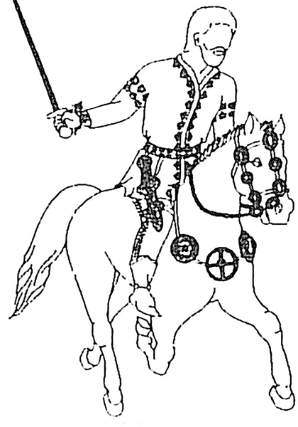 Реконструкция сарматского воина из кургана в Дачах в Ростове-на-Дону (рубеж I–II вв.). Реконструкция Азовского этнографического музея. Воспроизведено по: Блиев, Бзаров 2000: 63