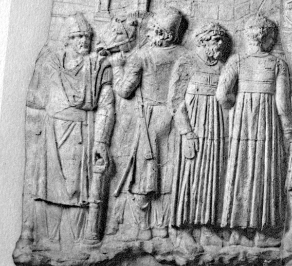 Посольства к императору Траяну. Двое слева считаются языгами. Посол одет в плащ, а его сопровождающий (второй слева) держит коня. Оба сармата одеты в длинные, ниже колен, рубахи с боковыми разрезами и длинными рукавами, штаны и низкую обувь; головной убор типа фески. Из вооружения показаны цилиндрический закрытый колчан и висящий слева меч в ножнах со скобой. Колонна Траяна в Риме (113 г.). Воспроизведено по: Istv?novits, Kulcs?r 2001: 156, fig. 12