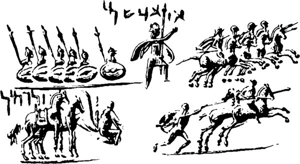 Эллинистические воины. Прорисовка оттиска сердоникового цилиндра эллинистического времени с арамейской надписью. Тут воины представлены в кельтском вооружении: в характерных шлемах с пуговкой наверху и овальными щитами. Справа сверху – атакующие всадники, вооруженные пиками. В центре – командир, призывающий воинов, в шлеме, со щитом и копьем. Внизу слева, видимо, «адъютант» последнего с двумя конями. Справа внизу – скачущий копьеносец и всадник, останавливающий своего убегающего коня. Воспроизведено по: Boardman J. Greek Gems and Finger Ringer: Early Bronze Age to Late Classical. London, 1970. P. 321, fig. 309