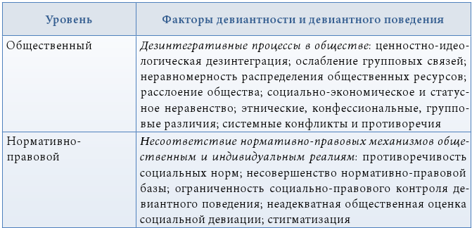 Распространяя идею конфликтной природы девиации на всю систему социальных отношений, можно выделить ведущие факторы отклоняющегося поведения личности (группы) на различных уровнях организации общественной жизни. В таблице 4 представлена структурно-уровневую модель детерминации девиантности и девиантного поведения [4].