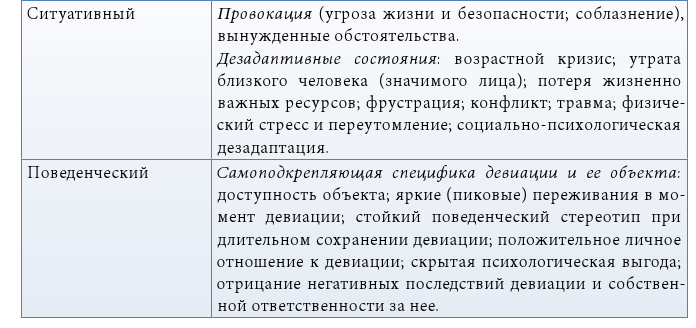 Доминирующий тип нарушенных отношений определяет и форму социальной девиации – ее деструктивный или аутодеструктивный вариант. Перечисленные паттерны межличностных отношений сопровождаются специфическими аффектами и рационализациями, образуя единый мотивационный комплекс и определяя устойчивую девиантную направленность личности.