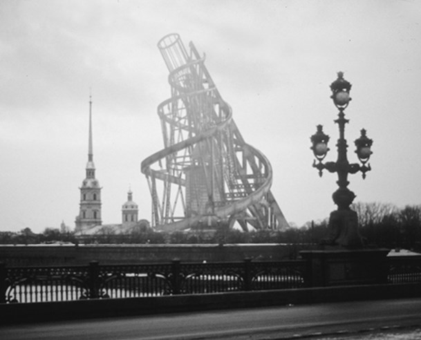 Виртуальный Петербург: вид с непостроенным памятником Третьему Интернационалу. Кадр из фильма «Башня Татлина» (1998). Продюсер и режиссер Такехико Нагакура; компьютерная графика Андрея Зарицкого, Такехико Нагакуры, Дэна Брика и Марка Сича