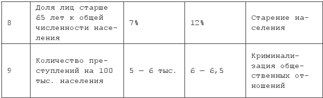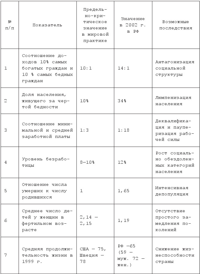 О социальных последствиях жестких рыночных реформ, проводимых в России в последние десятилетия, убедительно свидетельствуют данные статистики предельно-критических показателей развития Российской Федерации, приведенные в докладе академика РАН Г. В. Осипова на II Всероссийском социологическом конгрессе в 2003 г. (табл. 2) [8].