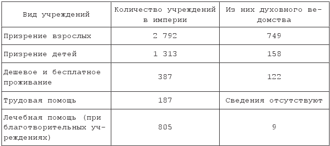 На всех этапах развития российского общества значимое место в системе социального призрения занимала Русская православная церковь. Почти четверть благотворительных учреждений в дореволюционной России относились к ведомству православной церкви (табл. 3).