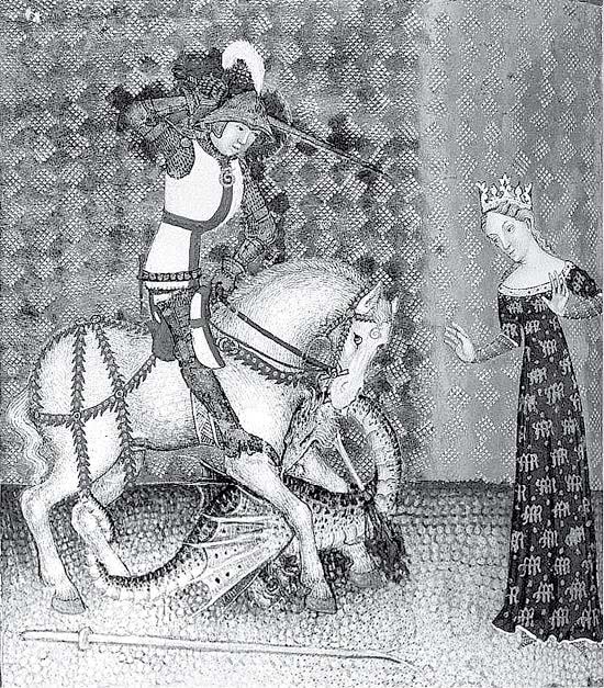 Святой Георгий и дракон. Миниатюра из рукописи. Национальная библиотека. Милан. Италия. 1385–1390