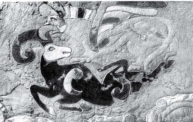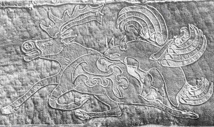 Сцена нападения орлиного грифона на горного барана. Войлочная аппликация на седельной покрышке. Находка из кургана «скифского времени». Алтай. V–IV вв. до н. э.