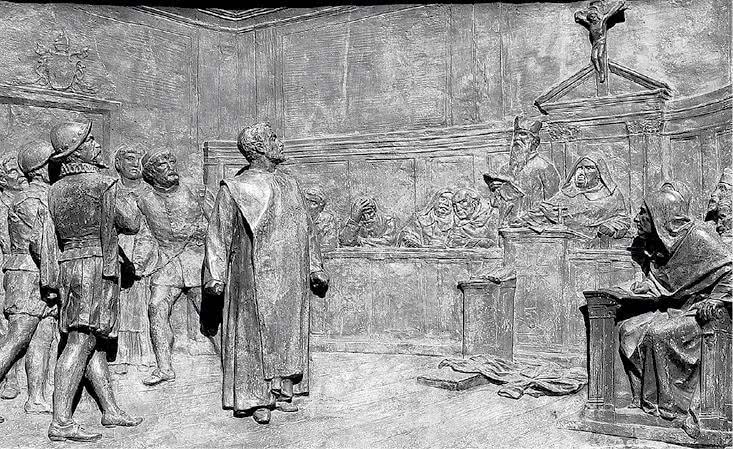 Этторе Феррари. Джордано Бруно выслушивает приговор Святой инквизиции. Бронзовый барельеф. Рим. 1889