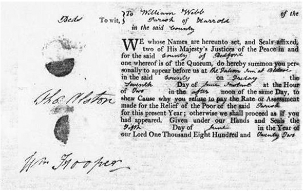 На имя Уильяма Вебба, приход Хэрролд, в указанном графстве. Мы, чьи имена здесь указаны и скреплены печатями, два мировых судьи Его Величества в графстве Бедфорд, призываем этой бумагой Вас явиться перед нами лично… в пятницу в два часа дня для предоставления объяснения, почему Вы отказываетесь платить налог на помощь бедным в указанном приходе за прошедший год; в случае неявки мы будем действовать так, будто Вы появились, но не объяснились. Написано нами и скреплено печатями в пятый день июня в год от Рождества Христова одна тысяча восемьсот двадцать второй.