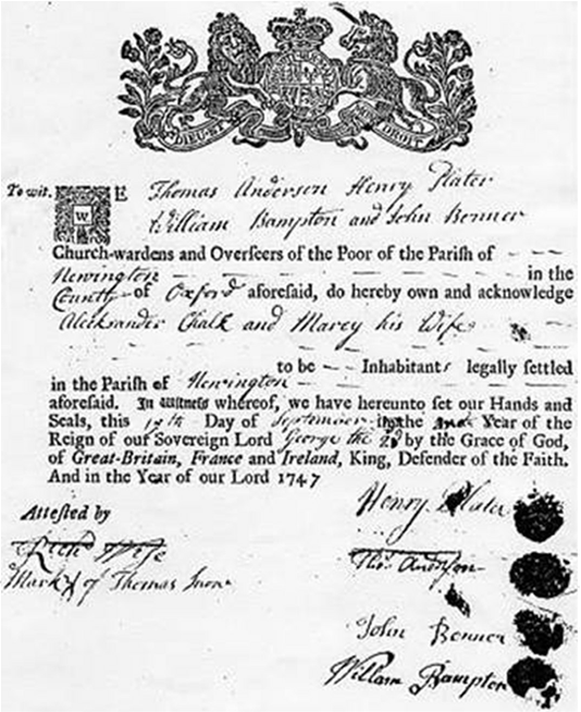 Одними из самых важных стали «Акты об оседлости», принятые в 1662 и 1697 гг. в дополнение к закону 1601 г. Они утвердили своего рода «институт прописки» пауперов: приход, являющийся для нуждающегося местом его «оседлости» (settlement), нес за него ответственность в случае возникновения необходимости в социальной помощи. Пауперу выдавался «сертификат оседлости» (settlement certificate) – своеобразный документ о «прописке», который в случае переезда на другое место жительства гарантировал, что «домашний» приход окажет ему поддержку. Такой закон принимался главным образом для того, чтобы пресечь миграцию бедняков в города, вызывавшую переполненность столичных приходов пауперами, и ограничить свободу передвижения по стране бродяг и нищих.[67]