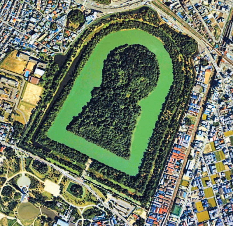 Курган императора Нинтоку, созданный в V веке, – один из наиболее знаменитых курганов в форме замочных скважин. С высоты человеческого роста эта форма почти не считывается. Бродя по дорожкам, обычный человек даже не поймет, что перед ним находится захоронение: такой курган выглядит как самый обычный парк, выступая частью привычного повседневного пейзажа. И только благодаря современной аэрофотосъемке можно увидеть его истинное предназначение – быть местом упокоения знатных людей, умерших больше тысячи лет назад.