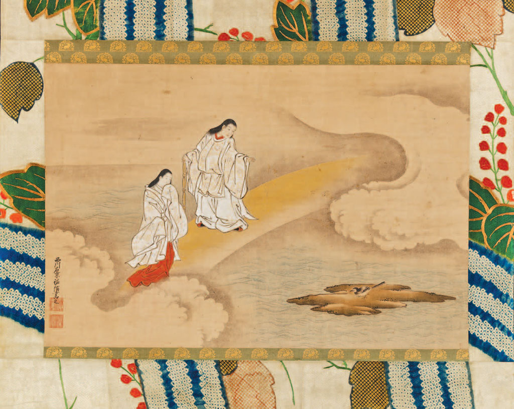 Бог Идзанаги и его божественная супруга Идзанами стояли на небесном парящем мосту, смотрели вниз и спрашивали друг друга, есть ли под их ногами земля. Чтобы выяснить это наверняка, они опустили копье, сделанное из драгоценного камня, таким образом обнаружив под собой океан.