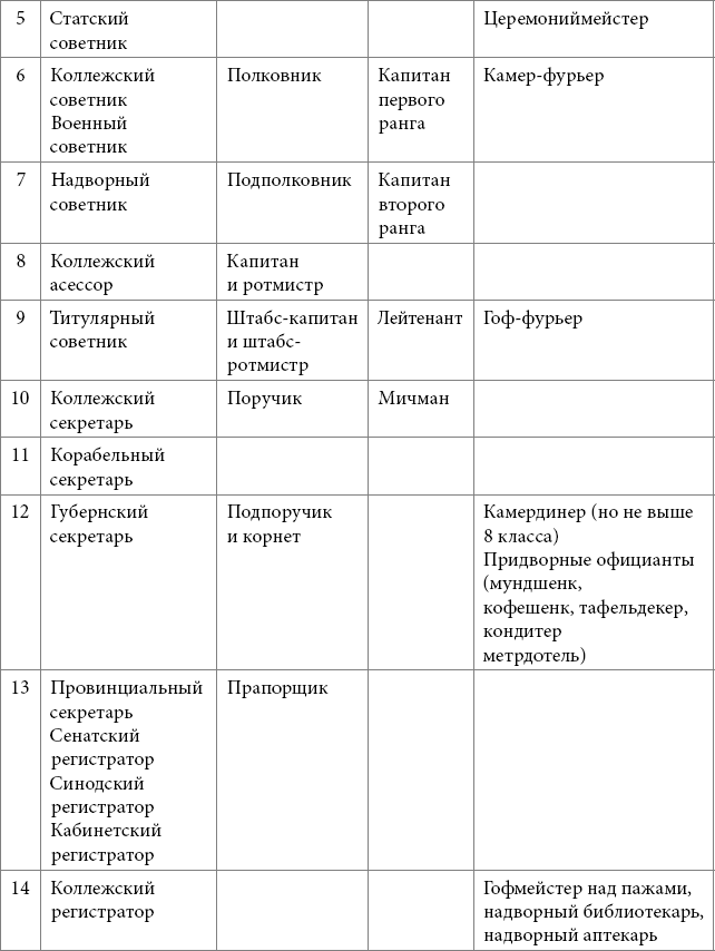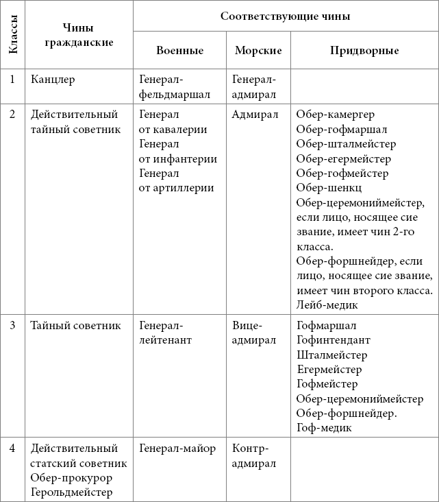 Табель о рангах состояла из расписания новых чинов по 14 классам или рангам и из 19 пояснительных пунктов к этому расписанию (см. табл. 1). К каждому классу были приписаны вновь введенные чины воинские (в свою очередь подразделявшиеся на сухопутные, гвардейские, артиллерийские и морские), статские и придворные.