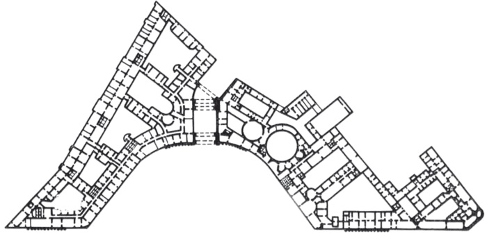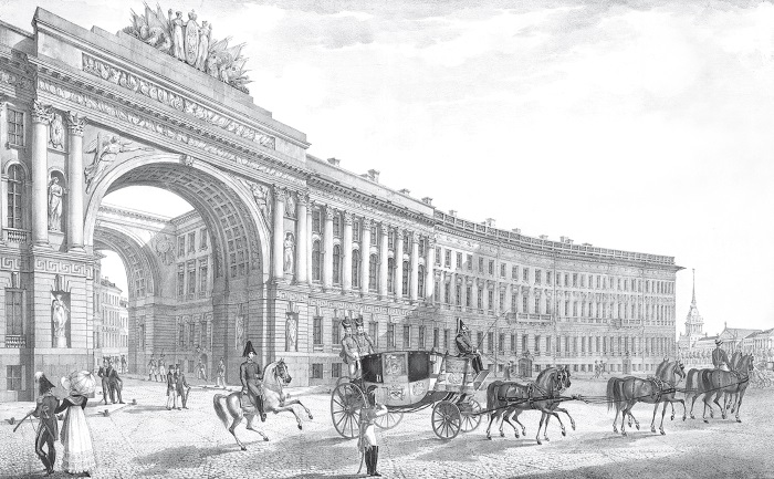 В ближней к Мойке части огромного здания Главного штаба расположились Министерство иностранных дел и Министерство финансов. Два крыла общей протяженностью 500 м соединила двойная арка высотой 28 м и шириной 17 м. Под ней оставлен проезд на площадь со стороны Невского проспекта по Большой Морской улице (тогда – Малой Миллионной, или Миллионной Луговой).