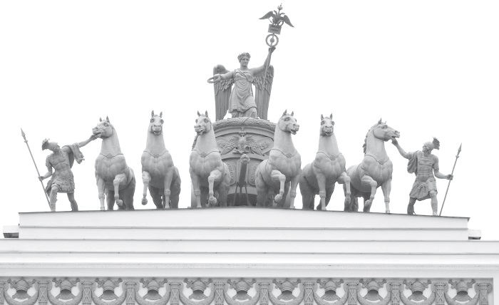 Таким образом, в 1830-х гг. на арке Главного штаба и появилась скульптурная группа, которую мы видим сегодня. Она изображает крылатую фигуру Славы (Победы), которая стоит в колеснице, запряженной шестеркой коней. Коней держат под уздцы вооруженные копьями воины.