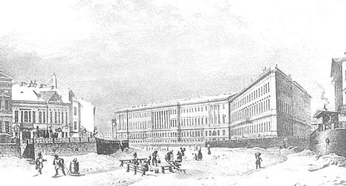 Вид здания Главного штаба со стороны Мойки.Литография К.П. Беггрова по рис. В. С. Садовникова. 1830-е гг.