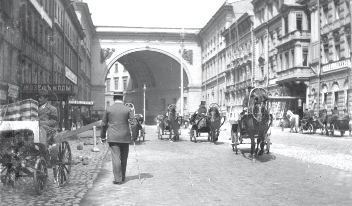Вид на арку Главного штаба со стороны Невского проспекта.Часы под аркой еще отсутствуют. Фото нач. 1900-х гг.