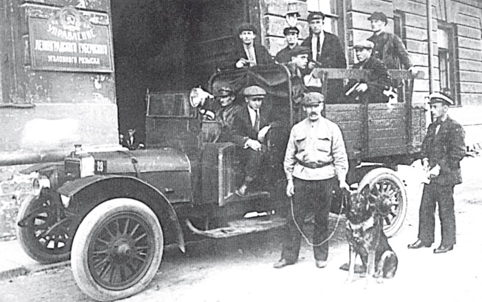 Готовая к выезду оперативная группа у входа в Управление Ленинградского губернского уголовного розыска со стороны Мойки. Фото между 1925-1930 гг.