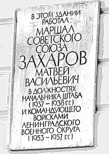 Долгие годы начальником штаба, а затем командующим ЛВО был маршал Советского Союза М.В. Захаров. Об этом сегодня напоминает укрепленная в 1973 г. на стене мраморная доска, выполненная архитектором Т.Н. Милорадович.