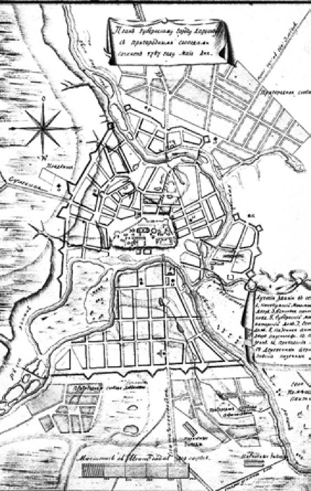 В начале XVIII столетия три ряда деревянных торговых рядов шли севернее Успенского собора до Московской проезжей башни, а торговые амбары – вдоль северной стены крепости от Московской башни к наугольной Деркачевской и Лопанской проезжей.