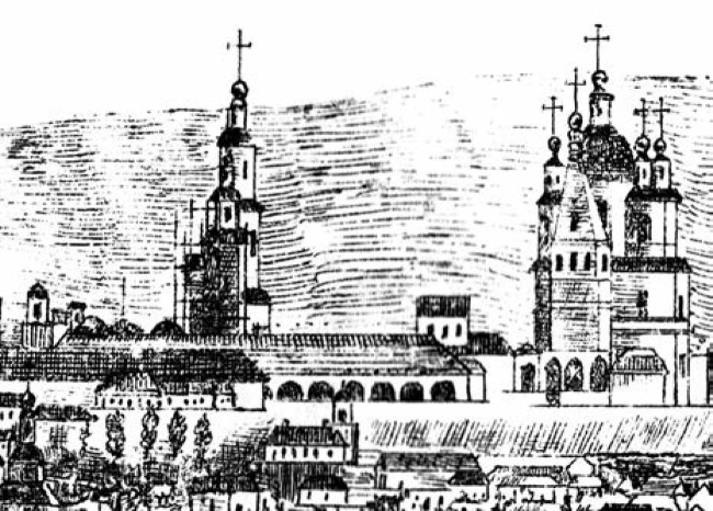 «В 1685–1687 годы внутри крепости, саженей на 25 к северу от деревянного Успенского собора, построен каменный, крестообразный собор с пятью главами, наказным полковником Авдием Григорьевичем (Донцом) и освящён в 1686 году с соборянами митрополитом Авраамием». Старый деревянный собор разобрали, а на месте одного из престолов этого храма была построена деревянная часовня. Она стояла в конце XVIII столетия за каменным зданием Магистрата и нечётко видна на панораме Харькова 1787 г. с западной стороны. Примерно в 40 м от западного фасада храма стояла массивная каменная Александровская колокольня с двумя коморами и погребом.