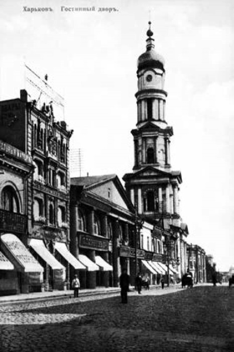 Каменный одноэтажный Гостиный двор был построен, вместо деревянных лавок, севернее Успенского собора по проекту архитектора Петра Ярославского в конце XVIII столетия. Его западный и восточный фасады формировали будущую улицу Университетскую и переулок Горяиновский. Он хорошо виден на гравюре 1780-х годов левее собора. В это же время большую часть домовладений, бывших когда-то внутри крепости, стали перестраивать с учётом торговых интересов, появились деревянные и каменные лавки, определившие во многом интересы всех обеспеченных слоёв харьковского общества. Более того, первые владельцы лавок Гостиного двора были почти все дворяне из среды казацкой старшины Харьковского полка да священнослужители, и лишь третья его часть принадлежала купечеству.