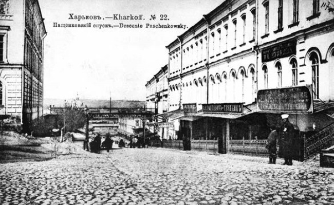 Уже в 1850-е в Харькове стали появляться магазины и Торговые дома. На Университетской первым построил трёхэтажный магазин купец Андрей Расторгуев, а потом его существенно расширили в 1866 году потомственные почётные граждане, временные московские купцы 1-й гильдии Иван Никитович Тряпкин и Василий Иванович Пащенко. Вначале они облагородили бывший Карповский гостиный ряд напротив Покровского монастыря, проект составил городовой архитектор Борис Семёнович Покровский[8]. А позднее взялись и за Купеческий спуск, выкупив территорию у наследников Расторгуева. Со временем владельцем этого и других общих с Тряпкиным дворовых мест в центре стал уроженец с. Пересечное Харьковского уезда Василий Пащенко, после смерти своего компаньона он унаследовал не только его состояние, но и в благодарность добавил его фамилию к своей, став Пащенко-Тряпкиным. Именно он превратил Купеческий спуск от Университетской до Клочковской в целый ряд элитных магазинов, среди которых особое место занимал «Пассаж». К сожалению, в уличных боях февраля – марта 1943 года бывшие здания Пащенко-Тряпкина пострадали и были разрушены, на этом месте в 1951–1952 годах был разбит террасный сквер, который носит сегодня имя Соборного сквера.