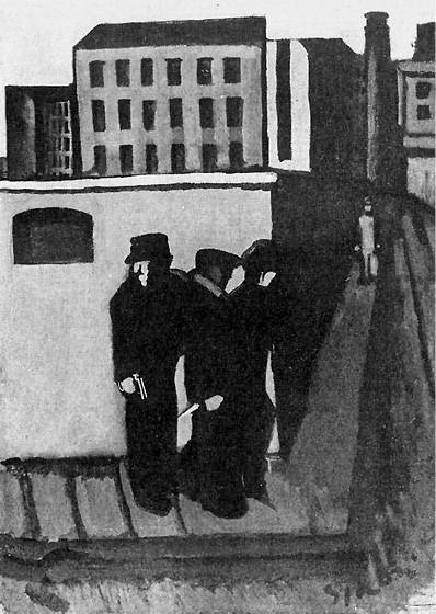 Эта роковая погрешность не помешала нескольким поколениям восхищенных читателей послушно следовать за своим кумиром. Такого накала фанатичной озлобленности достигли немногие противники буржуазии (разве что Эмиль Золя), однако флоберовские интонации стали разменной монетой для модернистов XIX века, готовых обвинить целый социальный класс в вымышленных грехах. Модернисты XX века продолжили поносить буржуазию в том же стиле. В 1920 году итальянский художник Марио Сирони, вскоре превратившийся в убежденного пропагандиста фашистских взглядов в искусстве, написал пустынный городской пейзаж со зловещими фигурами, вооруженными пистолетом и ножом и подстерегающими прилично одетого господина – читай буржуа, – который направляется по направлению к ним, не подозревая о том, что его ждет за углом. Эта классовая драма лапидарно озаглавлена «Antiborghese» («Антибуржуазное») (3) – и у нас нет оснований полагать, что автор хоть в малой степени осуждает этих головорезов.