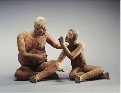 Возможно, изначально юноша держал что-то в левой руке, но что бы это ни было, оно не отвлекает мальчика, все его внимание обращено на мужчину. Сцепление их взглядов приковывает и наш взор. Между их глазами словно натянута струна. Струне этой три тысячи лет, но застывший в глазах вопрос и полученное в ответ терпеливое разъяснение волнуют нас до сих пор. Рука мужчины на плече юноши служит подтверждением тому, что взаимопонимание достигнуто. Юноша учится посредством визуального контакта.
