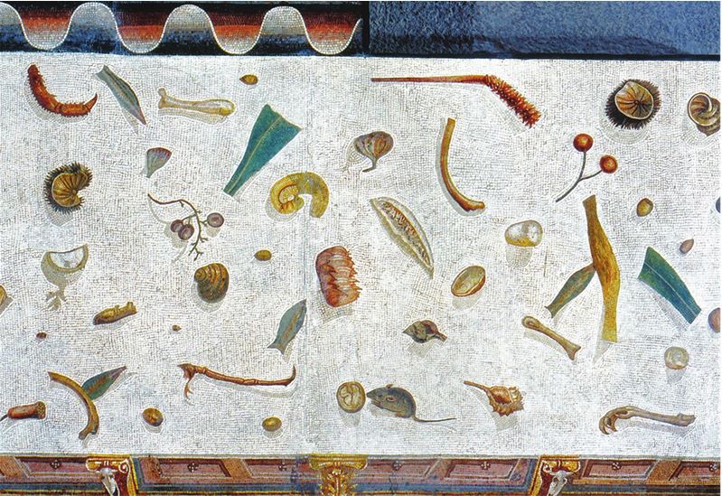 На римской мозаике II века н. э., известной как «Неподметенный пол», нет ничего, что выходило бы за пределы метафоры простых домашних радостей. Мы не видим людей за обеденным столом, зато видим то, что с него упало. Словно кто-то выдернул скатерть из натюрморта.