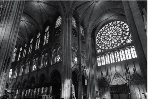 От прямоугольных греческих храмов – к римским аркам и готической филиграни: инженерные решения и архитектурный декор становились все более сложными. Внутри готического собора зрение выполняет не только свою основную функцию – мы не просто можем найти выход и то место, где священник будет служить мессу, – здесь мы смотрим так, как смотрим на небеса, на облака, проплывающие над головой. Собор Парижской Богоматери возводился для того, чтобы заставить нас поднять глаза, почувствовать свою незначительность, ощутить милость божию, узреть в каменных узорах и потоках света божественное присутствие, всецело отдаться созерцанию.