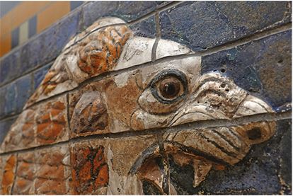 Ворота Иштар, богини любви и войны, были построены всего пятью годами раньше (вот они, воссозданные в половину высоты из подлинных материалов в Пергамском музее Берлина). Ворота облицованы ярко-синими глазурованными изразцами и декорированы золотым бордюром (это сочетание цветов уже попадалось нам в первой главе). Приблизившись, мы запрокидываем голову, чтобы рассмотреть верхнюю часть ворот, а вновь опуская глаза, встречаемся взглядом с одним из львов.