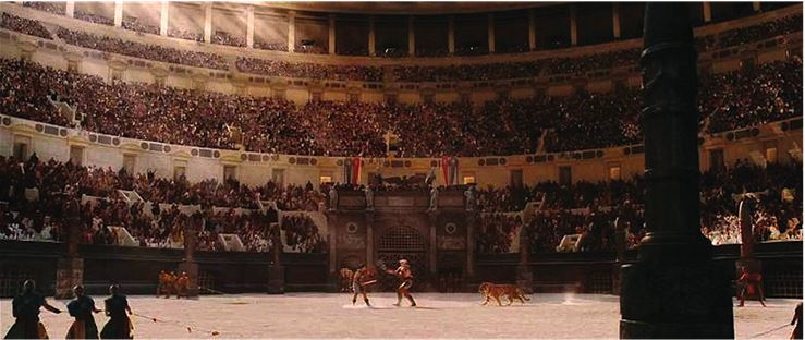Колизей. За неимением фотографий настоящего представления придется довольствоваться кадром из фильма Ридли Скотта «Гладиатор». Художник-постановщик Артур Макс провел серьезные изыскания, а что не нашел, то довообразил, воссоздавая эту грандиозную арену, освещенную каким-то осколочным светом. Заняв свои места, мы, надо думать, ощутим легкое головокружение. Это самый большой из всех амфитеатров в истории, он так велик, что в туманный день с одного конца его огромного эллипса не видно другого. Погода здесь имеет значение! Колизей вмещает 50 тысяч человек, целый город. На его строительство пошли средства, вырученные от продажи сокровищ Иерусалимского храма, который римляне разграбили десятью годами ранее.