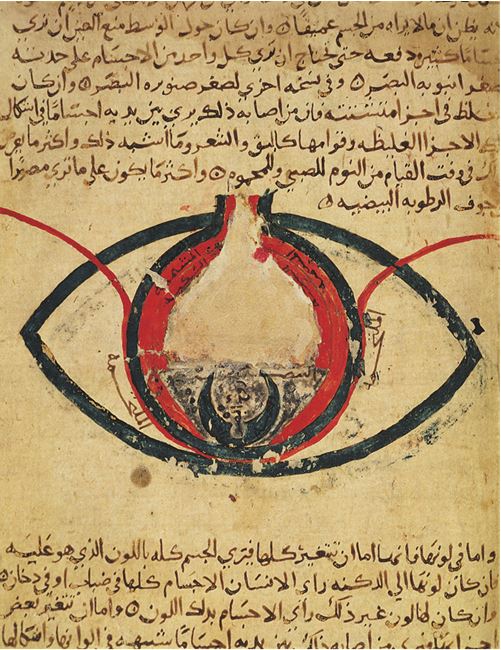 В эпоху правления Гаруна Багдад был занят не только самолюбованием, он взирал и на остальной мир. В город стекались ученые со всего света, в числе самых известных был Хунайн ибн Исхак – полиглот, врач и переводчик, который написал 36 книг и перевел еще 116. Хунайн родился около 809 года, много путешествовал, изучил греческий и перевел на арабский тексты Платона, Аристотеля и других классических авторов, сохранив их от забвения, а возможно, и от уничтожения в Темные века европейской истории. Неудивительно, что в городе, дающем такую богатую пищу для глаз, появилось одно из лучших творений Хунайна, превозносящее зрение, – «Книга десяти речений о глазе», где Хунайн доказывает, что зрение – величайшее из пяти чувств, и размышляет о работе глаза. На иллюстрации (см. с. 116) глаз показан в разрезе; внизу – внешний мир, сверху – мир внутренний, заключенный в нашем мозге.
