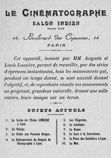 Рисунок 9. Оригинальное приглашение на исторический киносеанс в «Гран кафе» на бульваре Капуцинок. Текст приглашения: «Синематограф. «Индийский салон». «Гран кафе». Бульвар Капуцинок, 14, ПАРИЖ. Это устройство, изобретенное господами Огюстом и Луи Люмьер, позволяет собирать последовательности движений, происходящих в заданное время перед объективом, и воспроизводить их в натуральную величину, проецируя изображения на экран перед полным залом. В ПРОГРАММЕ: 1. «Выход рабочих с фабрики «Люмьер»; 2. «Вольтижировка»; 3. «Вылавливание красных рыбок»; 4. «Прибытие делегатов на фотоконгресс в Лионе»; 5. «Кузнецы»; 6. «Политый поливальщик»; 7. «Завтрак младенца»; 8. «Прыжок на брезент»; 9. «Площадь Корделье в Лионе»; 10. «Море»[1]