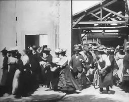 • «Выход рабочих с фабрики «Люмьер» (реж. Луи Люмьер, 1895 г.). Открываются большие ворота фабрики «Люмьер». На общем плане наблюдаем, как через ворота и через калитку рядом начинают выходить рабочие – в основном это женщины в длинных платьях и широких шляпках. Из толпы вырывается мужчина в длинном фартуке, его преследует большая собака, которая тут же начинает облаивать велосипедиста. Последними из ворот выезжают люди на велосипедах. Ворота начинают закрываться…