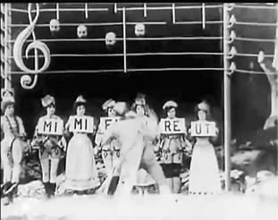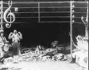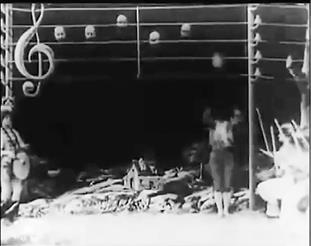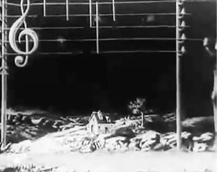 Таким образом снят, например, знаменитый «Меломан» (1903 г.) Мельеса (Рисунок 13). Учитель музыки (Мельес) со своими учениками останавливается перед столбами с натянутыми на них проводами. Учитель забрасывает на провода скрипичный ключ и трость, которые он принес с собой, а затем свою голову, потом еще одну, еще и еще – всего шесть голов. Начинается урок музыки – ученики исполняют три такта гимна «Боже, храни короля», при этом головы на нотном стане подпевают и перемещаются в соответствии с положением нот, лишние головы исчезают. Когда оркестр выходит из кадра, оставшиеся головы превращаются в птиц и улетают.