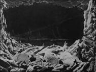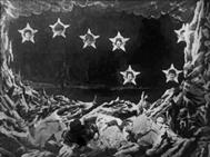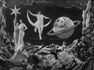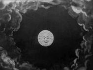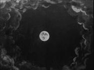 Для склеивания сцен Мельес использует наплыв – предыдущий кадр уходит в затемнение, следующий – выходит из затемнения. Внутри одной сцены фильма не меняются крупности, не двигается камера и нет монтажа – по аналогии с театром. Даже в сцене полета в космическом пространстве камера двигается только для создания эффекта приближения к Луне – облака при этом остаются на месте (Рисунок 15).