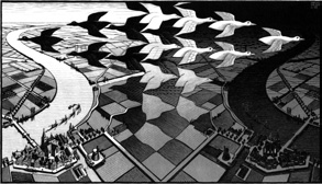 С этого момента мы, оставив позади повторение пройденного и осмысление его с позиций этого самого пройденного, начинаем двигаться дальше. Но прежде взгляните на гравюру Эшера, служащую зрительным эпиграфом к этой Увертюре и попробуйте дать ей свое толкование, то есть объяснение, почему она предваряет всё сказанное в этой главе.
