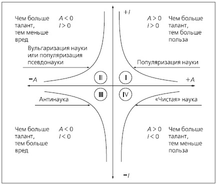 Третий квадрант – худший из всех возможных. Здесь способности автора сыграют против людей, читающих его произведение по своей воле или по принуждению. По счастью, лженаука очень редко влечет к себе гениев пера. Лозунг этой четверти рис. 5, следовательно, таков: «Чем больше талант, тем больше вред».