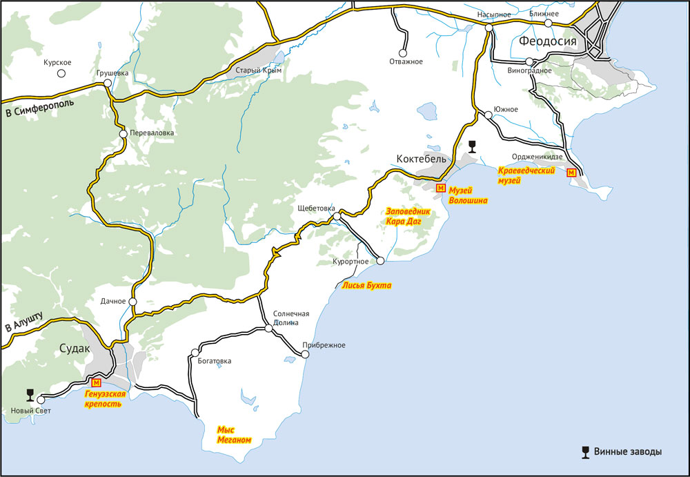 Самый быстрый путь в Коктебель из Феодосии лежит по трассе Р-23 Керчь – Симферополь, затем нужно свернуть на дорогу Р-29, идущую через Судак в Алушту. Рельеф дороги минимальный в обход самых высоких гор. К берегу идет долгий спуск. Для велосипедистов-любителей грунтов можно предложить пути через горное плато между Виноградным и Южным. К Ордженики-дзе можно также пройти по тропе по склону от Генуэзской крепости, а затем проехать по грунтовым дорогам. Вас там ждут крутые подъемы и красивейшие виды на море.
