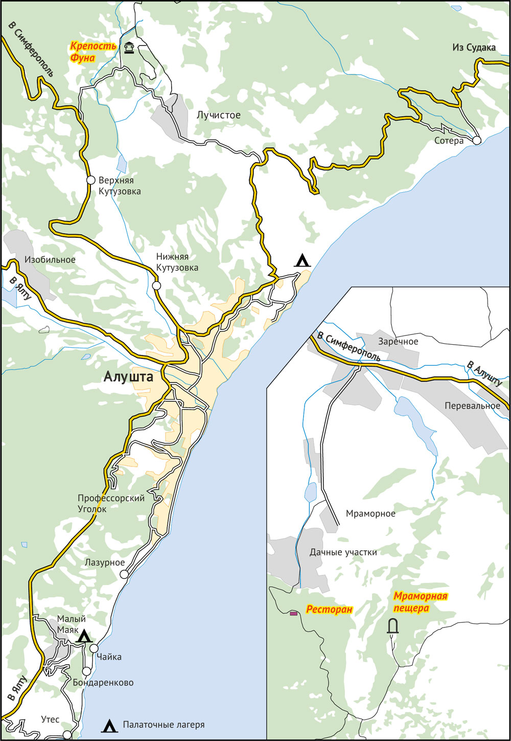 Далее путь лежит по шоссе Р-29 в Алушту. Для велосипедистов скажу, что вам предстоит преодолеть 95 км по сильно пересеченной местности с множеством горных перевалов. Горы невысокие (до 300 метров), но очень крутые с постоянными витками серпантинов. Обладая хорошей спортивной подготовкой, вы вполне можете проехать этот путь за один день. Однако для особо ленивых и изнеженных городской жизнью и офисной работой есть такси и водное сообщение до Ялты. Вовсе не обязательно проезжать это расстояние за один присест. Дорога два раза спускается к морю в поселки Морское, Рыбачье и Малореченское. Это курортные зоны со всей необходимой инфраструктурой, где можно поесть, искупаться, расслабиться и заночевать. Буквально за 2 км до Алушты можете завернуть в сторону на гору Демирджи, чтобы посмотреть остатки древней крепости Фуна, оставшейся с XIV века. Забравшись за самый удаленный от моря завиток шоссе, поверните по указателю на село Лучистое (см. карту 9). Посередине села вы найдете указатель на конный клуб «Золотая подкова». Проехав это ранчо, двигайтесь дальше в горы через Долину Привидений к горе Демирджи, где находится эта крепость. От села Лучистое 5–6 минут езды на машине. Этот музей под открытым небом платный и работает каждый день с 8:00 до 17:00. Ехать в Алушту не обязательно тем же путем. В другую сторону от крепости ведет другая грунтовка, соединяющаяся с дорогой на село Лаванда, от которого можо выйти на трассу Симферополь-Алушта. Крепость была построена в 1423 году и являлась южным форпостом княжества Феодоро. В северной части стояла квадратная башня и крепостная стена с двумя входами. Западная и восточная стены сходились под углом 170 градусов, и на их стыке располагалась трапецевидная башня шириной 4,8 метров. Задачей была защита торговых путей от моря в степную часть Крыма от генуэзцев. В конце 1423 года крепость сильно пострадала от землетрясения, и в 1453 году ее восстанавливали мангупские князья. Были построены дополнительные башни на западной и восточных линиях обороны. После этого она стала не только форпостом, но и резиденцией князя Александра. В крепости, конечно же, были построены и другие здания, позволяющие считать ее маленьким городом. Главным из них считается двухэтажная церковь святого Федора Стратилата. Эта крепость, несмотря на малые размеры (30?15 метров), играла важную роль в обороне. Но все равно, как мы узнаем из истории Алушты, эти места захватили Генуэзцы. Окончательно крепость была разрушена османами в 1475 году.