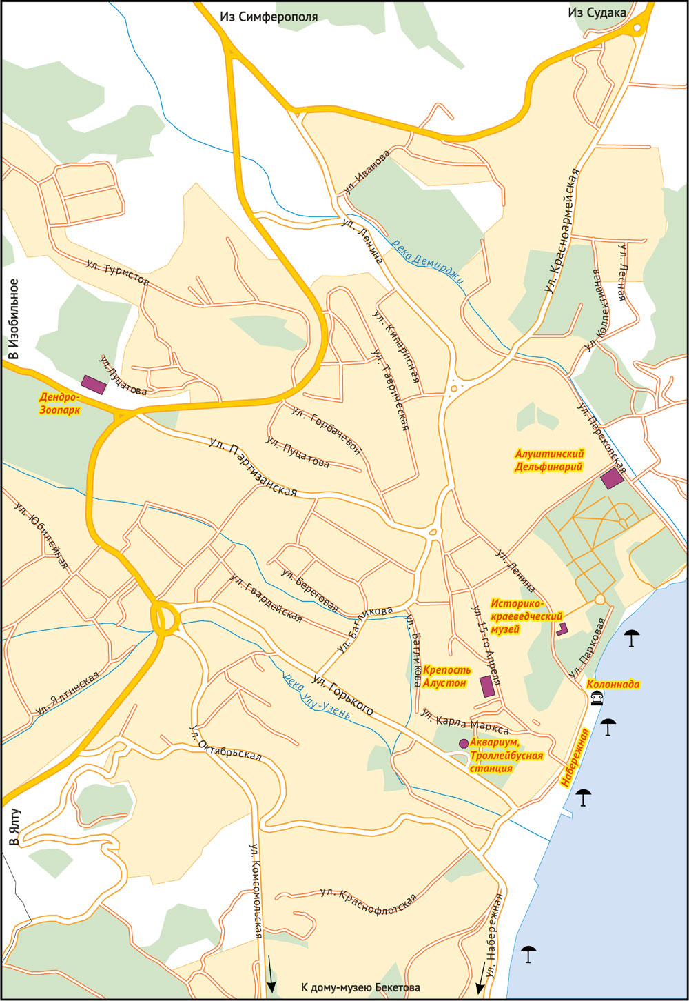 Алушта – древний крымский город, известный с античных времен. Здесь начинается Южный берег Крыма. История Алушты во многом совпадает с историей других крымских городов. Начинается она с основания крепости Алустон по приказу византийского императора Юстениана I в VI веке. В средневековье Алуста попеременно была опорным пунктом для Византии, хазарского каганата и небольшого славянского княжества Феодоро. В XIV веке усиливается экспансия генуэзских колоний, и в это время княжество Феодоро всеми силами пыталось удержать землю, создав систему обороны из приграничных крепостей. Одной из них является крепость Фуна на горе Демирджи в 2 км от села Лучистое, которую мы уже рассматривали на подъезде к Алуште, с востока. Но ничего не могло остановить их наступление и занятие города. В генуэзский период в XV веке город был опорным пунктом капитанства Готия и назывался городом Луста. Крепость наряду с Ялтой и Гурзуфом имела оборудованную византийскую пристань. До наших дней от крепости дошли лишь две башни. Но генуэзский период был недолгим. В том же веке, турки берут Константинополь, государство Византия прекращает свое существование, а Османская империя ищет пути расширения на север. 6 июня 1475 года после многих сражений за крымские земли город без боя занимают турки и сжигают его дотла. После завоевания Крыма османами крепость потеряла свое военно-морское значение, оставаясь небольшой приморской деревней. Однако во время русско-турецкой войны именно здесь высадились турецкие войска для сражения с русскими. Янычары были разбиты оперативным корпусом генерала В. П. Мусина-Пушкина. При этом был тяжело ранен и лишился глаза М. И. Кутузов, командовавший наносившим главный удар гренадерским батальоном.
