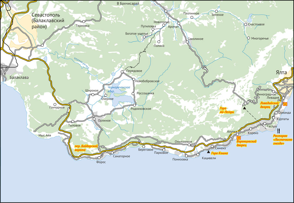 Ливадия – ппервый поселок, расположенный южнее Ялты. Из центра Ялты туда можно проехать по отдельной дороге, в которую переходит улица Сеченова. Главное, на что сюда едут смотреть, это Ливадийский дворец. Касса работает с 10:00 до 17:00, выходной понедельник. Посещение ведется с тематической экскурсией продолжительностью 1,5 часа. Это первая южная резиденция российских императоров. Дворец в лёгком «итальянском» стиле выстроен в конце XIX века архитектором Н. П. Красновым. Вместе с Во-ронцовским дворцом он претендует на звание самой роскошной резиденции Крыма. Здесь проходила встреча Рузвельта, Черчиля и Сталина по послевоенному мироустройству. В состав дворцового комплекса входят Свитский (Пажеский) корпус, дворец министра двора барона Фредерикса, дворцовая Крестовоздвиженская церковь, живописный дворцовый парк. Сердцем дворца является парковый итальянский дворик с розами и вечнозеленым растениями, а также беседками времен правления царя. Во дворике велись съемки фильмов. Каждое здание имеет свой неповторимый фасад. В помещениях дворца размещены экспозиции, посвященные жизни семьи Романовых и проходившей здесь международной конференции.