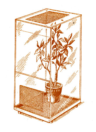 Под верхолазами следует подразумевать тех амфибий и рептилий, которые много времени проводят в кронах деревьев, листве кустарников, на стеблях высоких травянистых растений, хорошо перемещаются по вертикали. К ним относятся обыкновенные и дальневосточные квакши, средняя, зеленая, кавказская и другие ящерицы, лазающие полозы и др. Для них необходим особый террариум высотой 80 см при площади основания 50X50 см. Размеры эти условные, они по желанию любителя и его возможностям могут быть меньше или больше, а площадь основания и соответственно весь облик сооружения могут быть не только квадратными, но и прямоугольными, треугольными, многогранными. Каркас такого террариума изготовляется из хорошо просушенных гладких, без сучков, деревянных брусков, которые соединяются между собой путем врезки, склейки или с помощью шипов, шурупов и т. п. Каркас может быть изготовлен также из металла углового профиля (рис. 24).