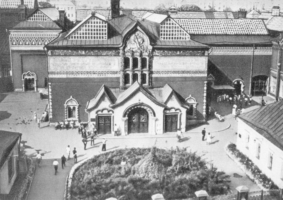 Усадьба Третьяковых за сорок лет неоднократно переделывалась. Еще в 1870-х годах Павел Михайлович пристраивает к дому в Лаврушинском дополнительные помещения для картинной галереи. По мере расширения коллекции вдоль красной линии Малого Толмачевского переулка по проекту А. С. Каминского строились новые экспозиционные залы. Кроме того, вдоль границы владения появлялись служебные корпуса. Специально для переданной в дар Москве галереи все тем же Каминским была возведена пышная ограда с парадным входом. После смерти Павла Михайловича в течение 1899–1906 годов главный дом был переоборудован под выставочные залы. Фасад, оформленный по рисунку В. М. Васнецова, стал на многие годы эмблемой Третьяковской галереи. Центральная часть фасада была выделена шикарным кокошником с рельефным изображением Георгия Победоносца – древнего герба Москвы. В то время художники проявляли интерес к формам древнерусского искусства. Мы это еще увидим на примере Покровского собора Марфо-Мариинской обители. Роскошно украшенные порталы, пышные наличники окон, яркие узоры и прочие украшения – все это говорит о стремлении Васнецова сделать из Третьяковской галереи древнерусский сказочный терем.