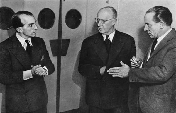 Л. Ф. Мясин, М. В. Добужинский, Н. А. Бенуа. Фот. 1952 г.